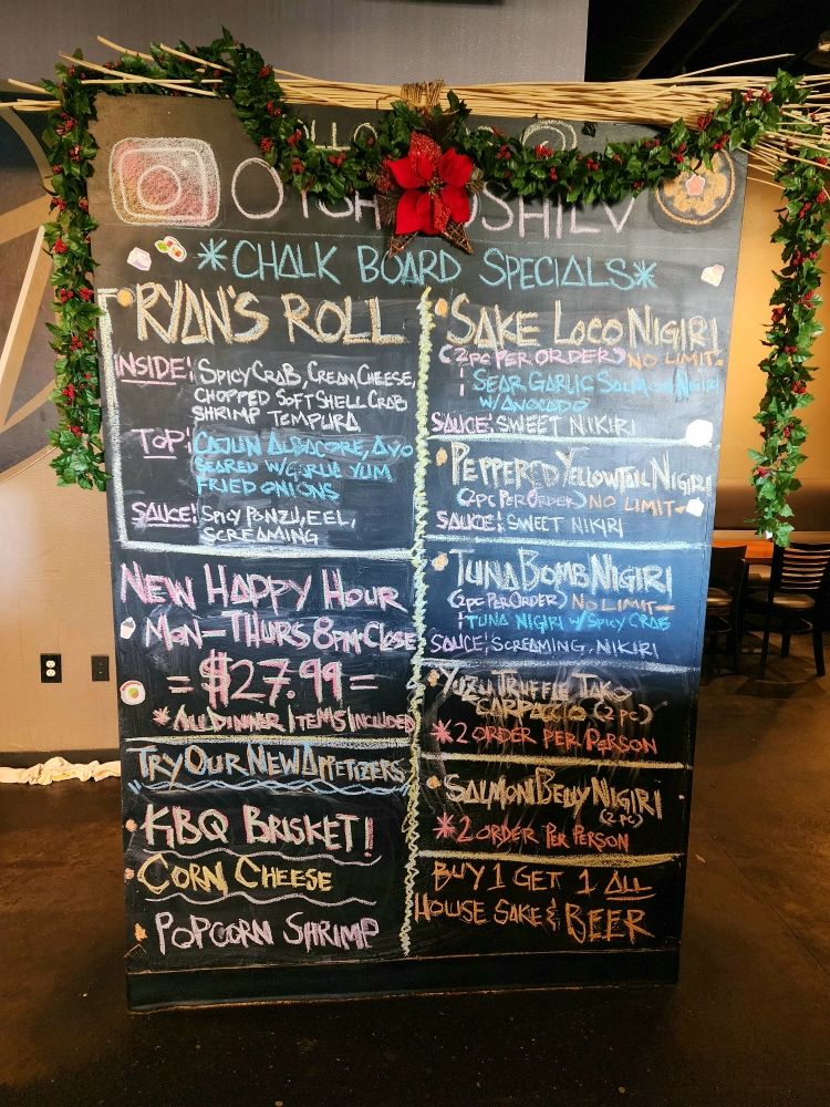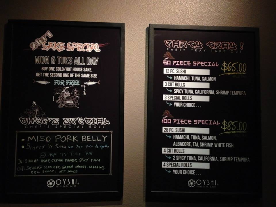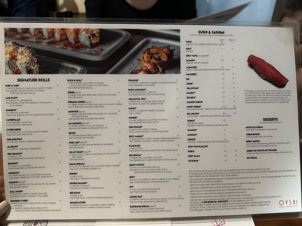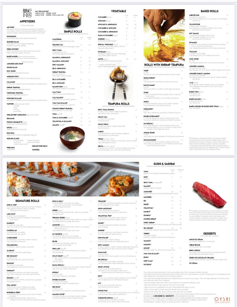 Introducing the menu at Oyshi Sushi, located in Las Vegas, brings a selection of cold and hot appetizers, along with soups like Japanese miso and spicy seafood soup. The restaurant offers a range of amenities such as reservation options, delivery, and takeout services, making it convenient for customers. Vegan and limited vegetarian options are available, alongside wheelchair accessibility and ample parking space. The customer reviews highlight the quick service, vast sushi choices, and the must-try salmon belly dish. The all-you-can-eat sushi option is praised for its quality and variety. Oyshi Sushi stands out for its fresh fish, friendly service, and unique chef's specials menu. Try their specialty dishes like surf and turf, baked mussels, and pork belly skewers for a memorable dining experience.
