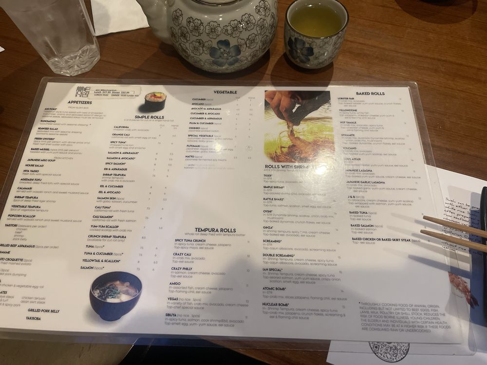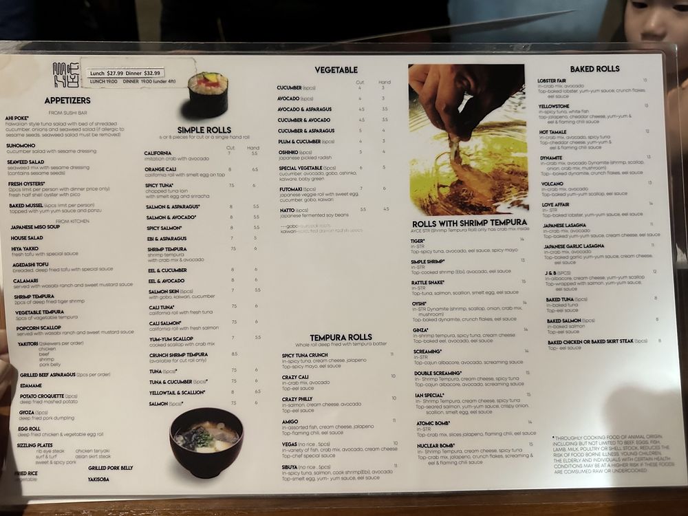 California or spicy tuna roll, and shrimp & vegetable tempura.