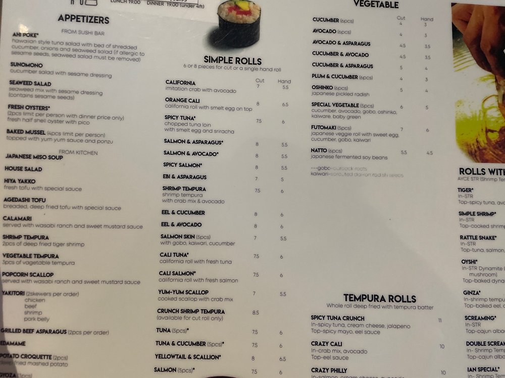 Shrimp tempura, spicy tuna, cream cheese, avocado, top-Seared rib eye, crispy onion, tempura crunch, eel sauce, screaming sauce